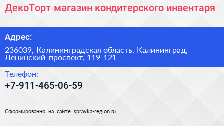 ДекоТорт, магазин кондитерского инвентаря по адресу 236039, Калининградская область, Калининград, Ленинский проспект, 119-121 в дальнейшем Организация, размещена в следующих категориях: