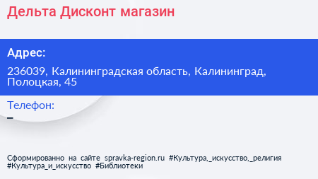 Дельта Дисконт, магазин по адресу 236039, Калининградская область, Калининград, Полоцкая, 45 в дальнейшем Организация, размещена в следующих категориях: