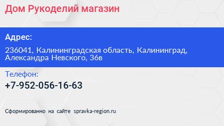 Дом Рукоделий, магазин по адресу 236041, Калининградская область, Калининград, Александра Невского, 36в в дальнейшем Организация, размещена в следующих категориях: