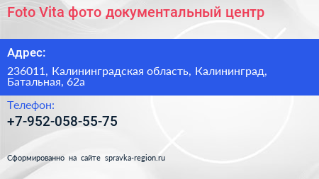 Foto Vita, фото-документальный центр по адресу 236011, Калининградская область, Калининград, Батальная, 62а в дальнейшем Организация, размещена в следующих категориях: