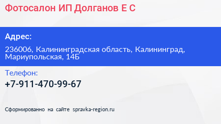 Фотосалон, ИП Долганов Е.С. по адресу 236006, Калининградская область, Калининград, Мариупольская, 14Б в дальнейшем Организация, размещена в следующих категориях:
