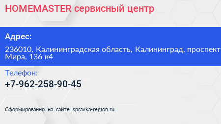 HOMEMASTER, сервисный центр по адресу 236010, Калининградская область, Калининград, проспект Мира, 136 к4 в дальнейшем Организация, размещена в следующих категориях: