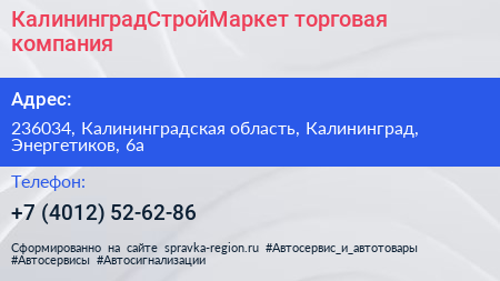 КалининградСтройМаркет, торговая компания по адресу 236034, Калининградская область, Калининград, Энергетиков, 6а в дальнейшем Организация, размещена в следующих категориях: