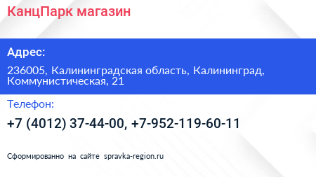 КанцПарк, магазин по адресу 236005, Калининградская область, Калининград, Коммунистическая, 21 в дальнейшем Организация, размещена в следующих категориях: