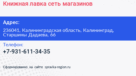 Книжная лавка, сеть магазинов по адресу 236041, Калининградская область, Калининград, Старшины Дадаева, 66 в дальнейшем Организация, размещена в следующих категориях: