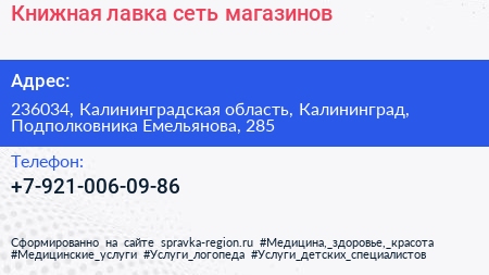 Книжная лавка, сеть магазинов по адресу 236034, Калининградская область, Калининград, Подполковника Емельянова, 285 в дальнейшем Организация, размещена в следующих категориях: