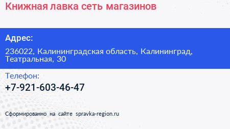 Книжная лавка, сеть магазинов по адресу 236022, Калининградская область, Калининград, Театральная, 30 в дальнейшем Организация, размещена в следующих категориях: