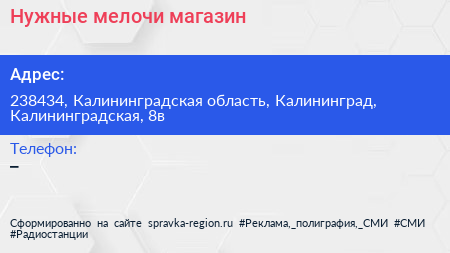 Нужные мелочи, магазин по адресу 238434, Калининградская область, Калининград, Калининградская, 8в в дальнейшем Организация, размещена в следующих категориях: