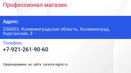 Профессионал, магазин по адресу 236023, Калининградская область, Калининград, Курганская, 3 в дальнейшем Организация, размещена в следующих категориях: