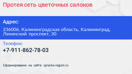 Протея, сеть цветочных салонов по адресу 236006, Калининградская область, Калининград, Ленинский проспект, 30 в дальнейшем Организация, размещена в следующих категориях:
