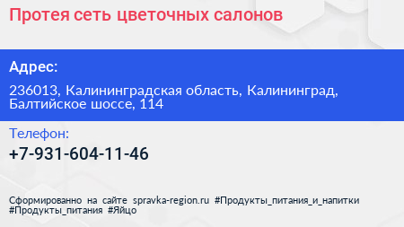 Протея, сеть цветочных салонов по адресу 236013, Калининградская область, Калининград, Балтийское шоссе, 114 в дальнейшем Организация, размещена в следующих категориях: