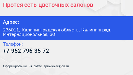 Протея, сеть цветочных салонов по адресу 236011, Калининградская область, Калининград, Интернациональная, 30 в дальнейшем Организация, размещена в следующих категориях: