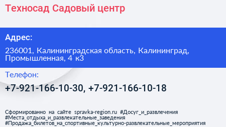 Техносад, Садовый центр по адресу 236001, Калининградская область, Калининград, Промышленная, 4 к3 в дальнейшем Организация, размещена в следующих категориях: