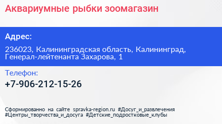 Аквариумные рыбки, зоомагазин по адресу 236023, Калининградская область, Калининград, Генерал-лейтенанта Захарова, 1 в дальнейшем Организация, размещена в следующих категориях: