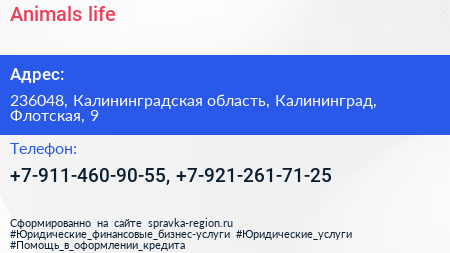 Animals life по адресу 236048, Калининградская область, Калининград, Флотская, 9 в дальнейшем Организация, размещена в следующих категориях: