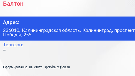 Балтон по адресу 236010, Калининградская область, Калининград, проспект Победы, 255 в дальнейшем Организация, размещена в следующих категориях: