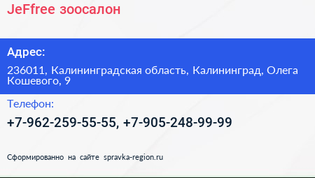 JeFfree, зоосалон по адресу 236011, Калининградская область, Калининград, Олега Кошевого, 9 в дальнейшем Организация, размещена в следующих категориях: