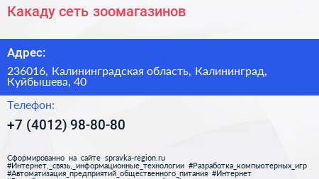 Какаду, сеть зоомагазинов по адресу 236016, Калининградская область, Калининград, Куйбышева, 40 в дальнейшем Организация, размещена в следующих категориях: