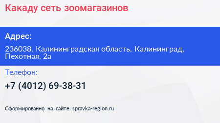 Какаду, сеть зоомагазинов по адресу 236038, Калининградская область, Калининград, Пехотная, 2а в дальнейшем Организация, размещена в следующих категориях: