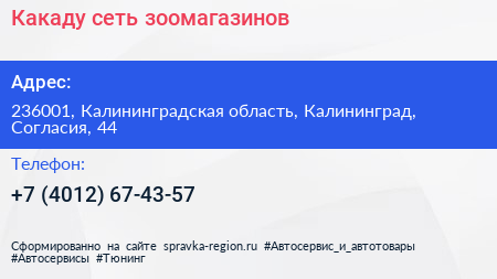 Какаду, сеть зоомагазинов по адресу 236001, Калининградская область, Калининград, Согласия, 44 в дальнейшем Организация, размещена в следующих категориях: