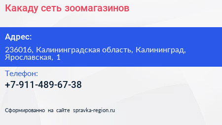 Какаду, сеть зоомагазинов по адресу 236016, Калининградская область, Калининград, Ярославская, 1 в дальнейшем Организация, размещена в следующих категориях: