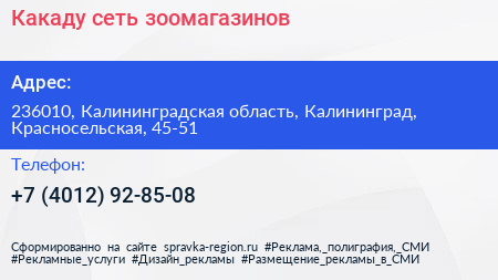 Какаду, сеть зоомагазинов по адресу 236010, Калининградская область, Калининград, Красносельская, 45-51 в дальнейшем Организация, размещена в следующих категориях: