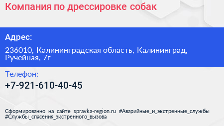 Компания по дрессировке собак по адресу 236010, Калининградская область, Калининград, Ручейная, 7г в дальнейшем Организация, размещена в следующих категориях: