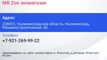 MR.Zoo, зоомагазин по адресу 236011, Калининградская область, Калининград, Машиностроительная, 60 в дальнейшем Организация, размещена в следующих категориях: