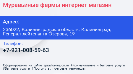 Муравьиные фермы, интернет-магазин по адресу 236022, Калининградская область, Калининград, Генерал-лейтенанта Озерова, 19 в дальнейшем Организация, размещена в следующих категориях: