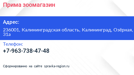 Прима, зоомагазин по адресу 236001, Калининградская область, Калининград, Озёрная, 31а в дальнейшем Организация, размещена в следующих категориях:
