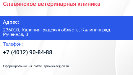 Славянское, ветеринарная клиника по адресу 236010, Калининградская область, Калининград, Ручейная, 3 в дальнейшем Организация, размещена в следующих категориях: