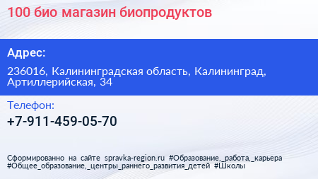 100% био, магазин биопродуктов по адресу 236016, Калининградская область, Калининград, Артиллерийская, 34 в дальнейшем Организация, размещена в следующих категориях: