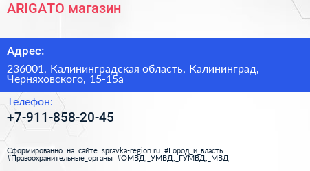 ARIGATO, магазин по адресу 236001, Калининградская область, Калининград, Черняховского, 15-15а в дальнейшем Организация, размещена в следующих категориях: