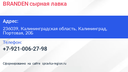 BRANDEN, cырная лавка по адресу 236039, Калининградская область, Калининград, Портовая, 20Б в дальнейшем Организация, размещена в следующих категориях: