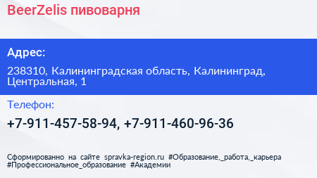 BeerZelis, пивоварня по адресу 238310, Калининградская область, Калининград, Центральная, 1 в дальнейшем Организация, размещена в следующих категориях: