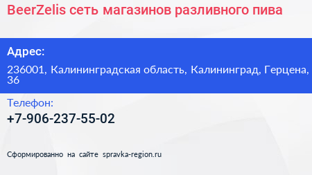 BeerZelis, сеть магазинов разливного пива по адресу 236001, Калининградская область, Калининград, Герцена, 36 в дальнейшем Организация, размещена в следующих категориях: