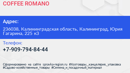 COFFEE ROMANO по адресу 236038, Калининградская область, Калининград, Юрия Гагарина, 225 к3 в дальнейшем Организация, размещена в следующих категориях: