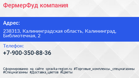 ФермерФуд, компания по адресу 238313, Калининградская область, Калининград, Библиотечная, 2 в дальнейшем Организация, размещена в следующих категориях: