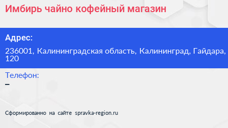 Имбирь, чайно-кофейный магазин по адресу 236001, Калининградская область, Калининград, Гайдара, 120 в дальнейшем Организация, размещена в следующих категориях:
