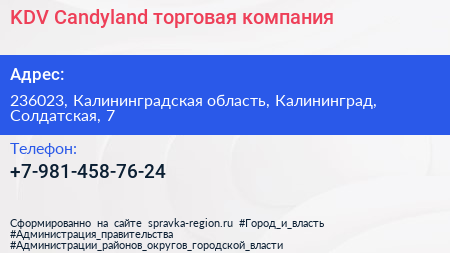 KDV Candyland, торговая компания по адресу 236023, Калининградская область, Калининград, Солдатская, 7 в дальнейшем Организация, размещена в следующих категориях:
