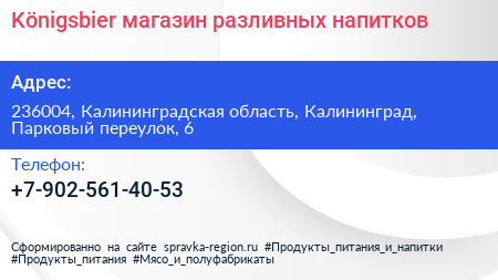 Königsbier, магазин разливных напитков по адресу 236004, Калининградская область, Калининград, Парковый переулок, 6 в дальнейшем Организация, размещена в следующих категориях: