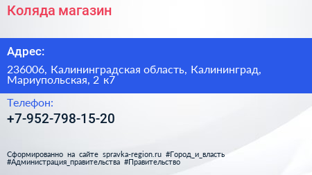 Коляда, магазин по адресу 236006, Калининградская область, Калининград, Мариупольская, 2 к7 в дальнейшем Организация, размещена в следующих категориях: