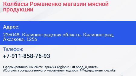 Колбасы Романенко, магазин мясной продукции по адресу 236048, Калининградская область, Калининград, Аксакова, 125а в дальнейшем Организация, размещена в следующих категориях: