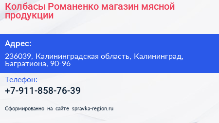 Колбасы Романенко, магазин мясной продукции по адресу 236039, Калининградская область, Калининград, Багратиона, 90-96 в дальнейшем Организация, размещена в следующих категориях: