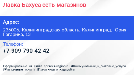 Лавка Бахуса, сеть магазинов по адресу 236006, Калининградская область, Калининград, Юрия Гагарина, 13 в дальнейшем Организация, размещена в следующих категориях: