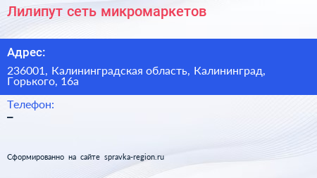 Лилипут, сеть микромаркетов по адресу 236001, Калининградская область, Калининград, Горького, 16а в дальнейшем Организация, размещена в следующих категориях: