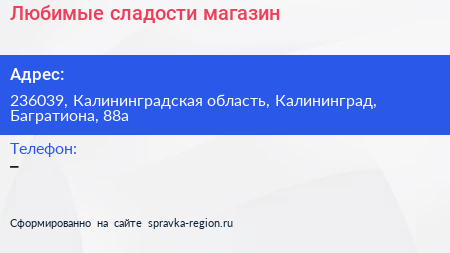 Любимые сладости, магазин по адресу 236039, Калининградская область, Калининград, Багратиона, 88а в дальнейшем Организация, размещена в следующих категориях: