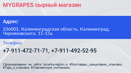 MYGRAPES, сырный магазин по адресу 236001, Калининградская область, Калининград, Черняховского, 15-15а в дальнейшем Организация, размещена в следующих категориях: