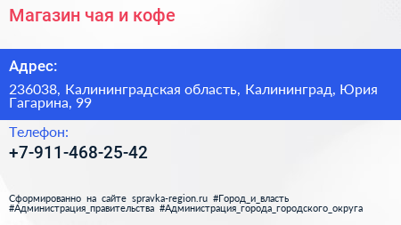 Магазин чая и кофе по адресу 236038, Калининградская область, Калининград, Юрия Гагарина, 99 в дальнейшем Организация, размещена в следующих категориях: