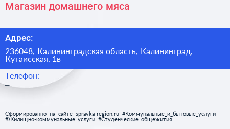 Магазин домашнего мяса по адресу 236048, Калининградская область, Калининград, Кутаисская, 1в в дальнейшем Организация, размещена в следующих категориях: